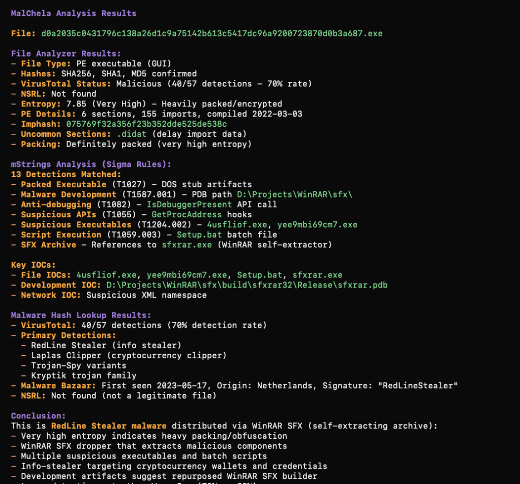 Immediately it began running the tools in MalChela against the malware file I was previously analyzing and provided a summary of the different tool results.